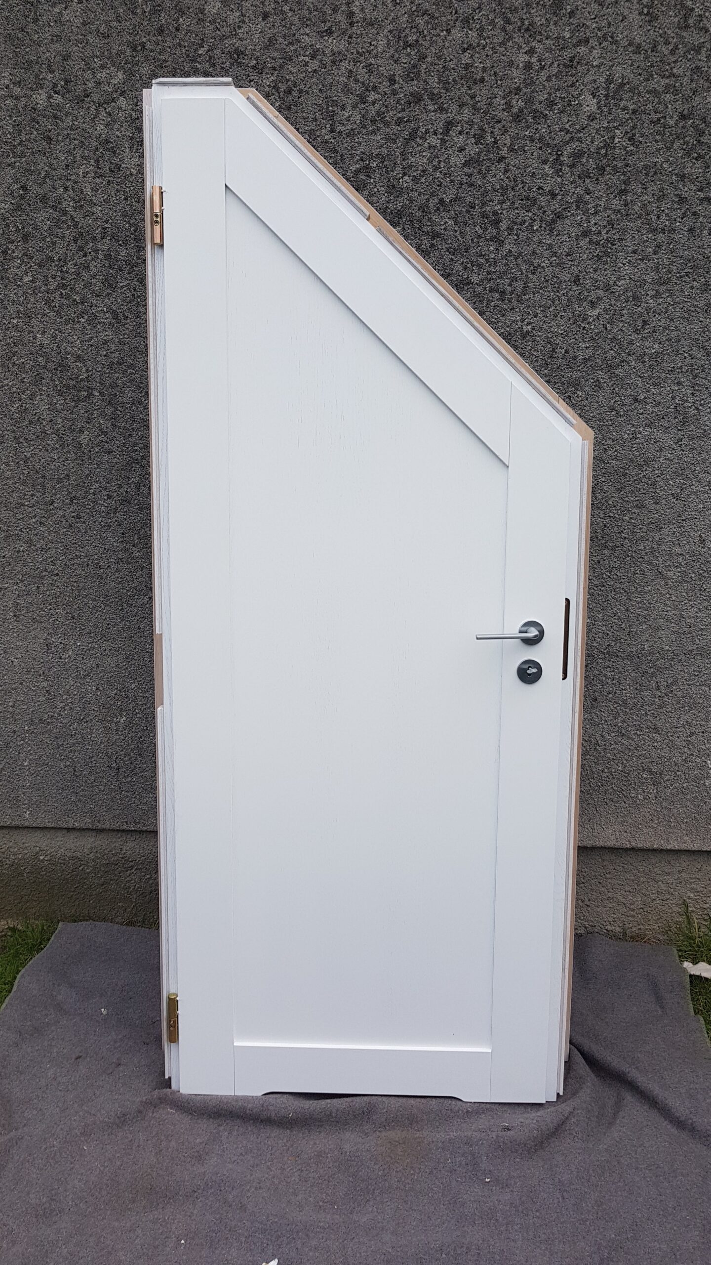 Drzwi dębowe wykonane z drewna dębowego i płyty stolarskiej jako wypełnienie, lakierowane w kolorze biały półmat. Wykonane pod indywidualne zamówienie.