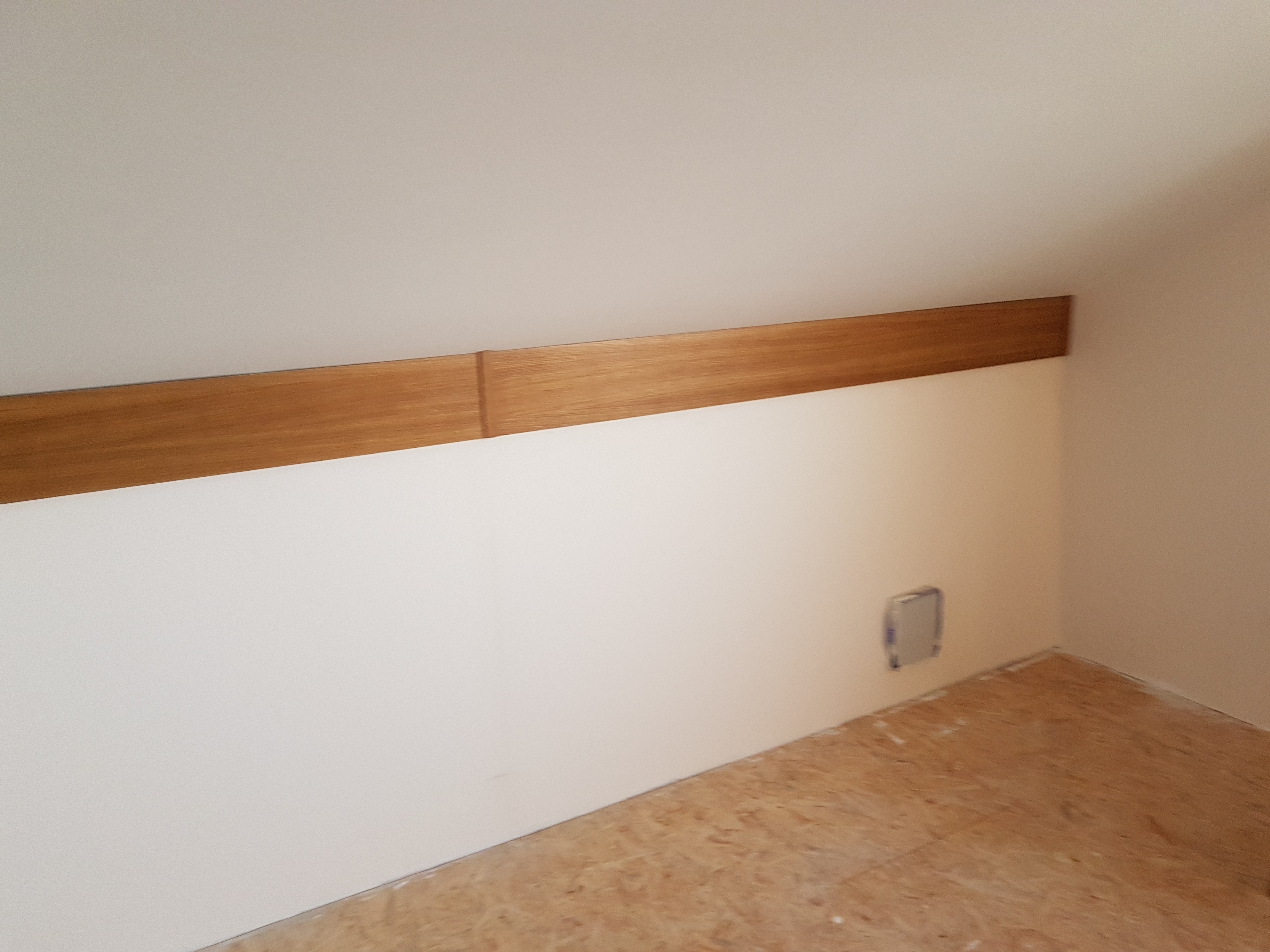 Zabudowa legarów podsufitowych wykonana z płyty stolarskiej (dębowej) barwiona i lakierowana.